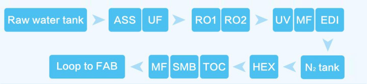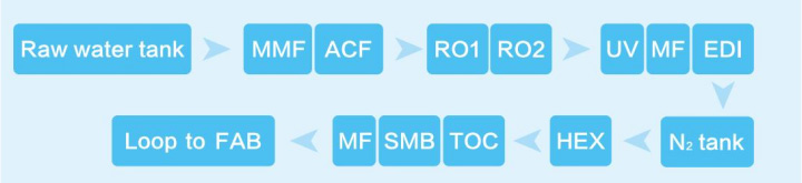 工藝特點:水中大部分的鹽分采用反滲透方式去除,后段采用MB系統制取高純水,可有效的延長MB系統的再生周期,減少酸堿的使用量。